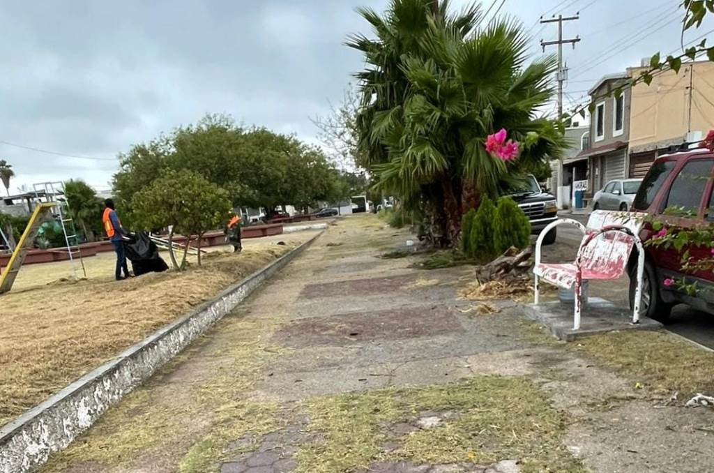 Este día, cuadrillas de la Secretaría de Servicios Públicos laboran desde temprana hora en la limpieza de la plaza en la colonia Jardines Coloniales y con chapoleo, barrido y retiro de maleza de la plaza de Tres Picos con Río Tuxpan, en la colonia Las Lomas.