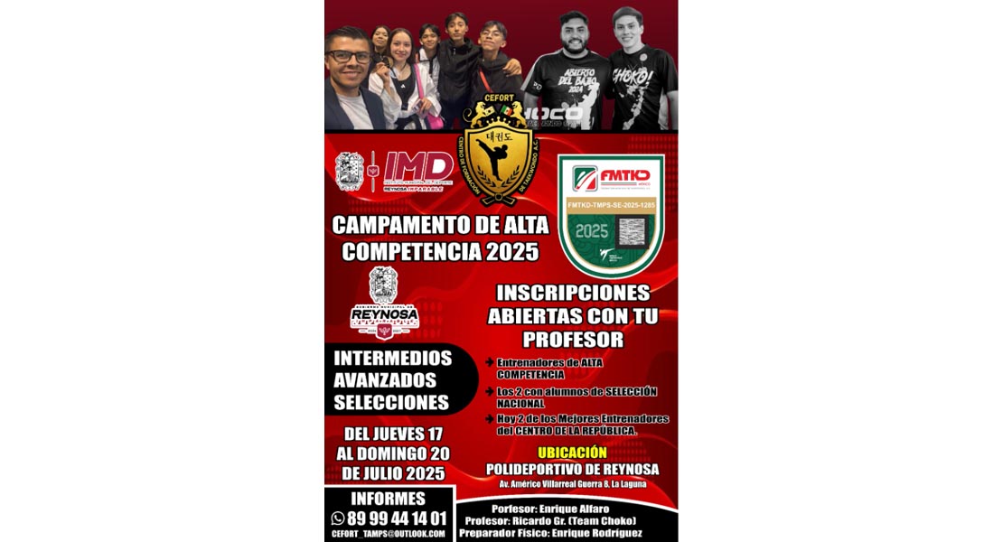 Reynosa, Tam.- El Alcalde Carlos Peña Ortiz, continúa impulsando el desarrollo deportivo de alto rendimiento al ser sede del Campamento de Alta Competencia 2025 en la disciplina de Taekwondo que se llevará a cabo del jueves 17 al domingo 20 de julio en las instalaciones del Polideportivo .