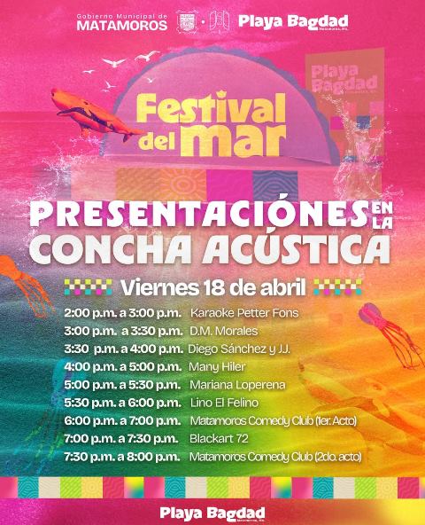 Este viernes 18 de abril, la Concha Acústica de la Playa Bagdad será el escenario principal donde se presentarán diversas agrupaciones musicales, intérpretes solistas, comediantes y otros exponentes del arte escénico originarios de Matamoros y sus alrededores. A partir de las 2:00 p.m., visitantes y residentes podrán disfrutar de un programa variado que promueve la convivencia familiar en un ambiente seguro, alegre y completamente gratuito.