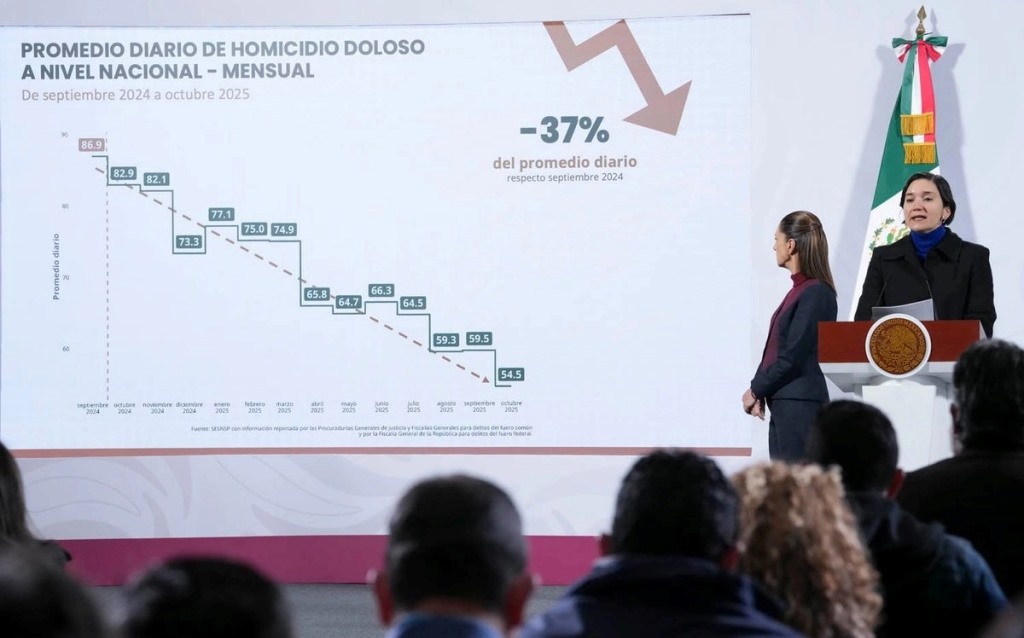 En su intervención, destacó que a nivel nacional el promedio diario de homicidios dolosos disminuyó 37% en octubre de 2025, en comparación con septiembre de 2024.