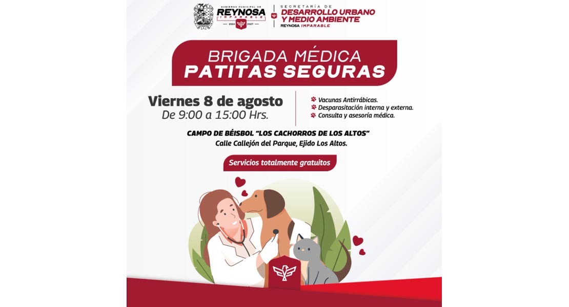 Reynosa, Tam.- Para el Presidente Municipal Carlos Peña Ortiz, todos los animales merecen respeto, cuidado y la atención del Gobierno Municipal de Reynosa; el próximo viernes 8 de agosto la brigada médica Patitas Seguras estará dando servicios gratuitos en el poblado Los Altos de 9:00 A. M. a 3:00 P. M.