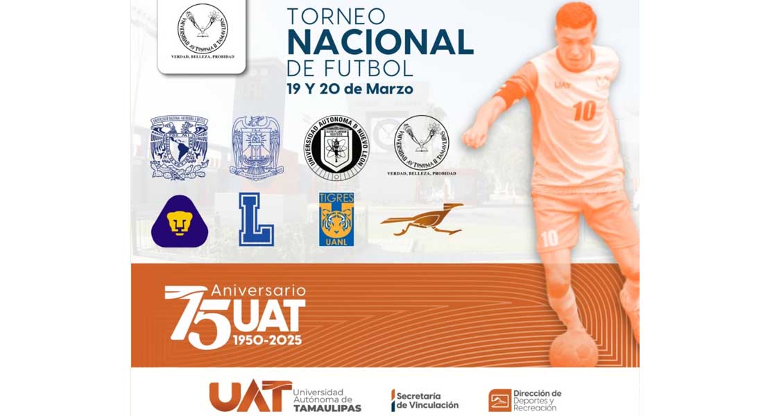 Cd Victoria, Tam.- Dentro del marco del 75 aniversario de la Universidad Autónoma de Tamaulipas (UAT), el próximo miércoles 19 y jueves 20 de marzo, del presente, se estará disputando el Torneo Cuadrangular de Futbol Estudiantil Universitario, en que los Correcaminos recibirán a Pumas de la UNAM, Tigres UANL y Lobos de la Autónoma de Coahuila.